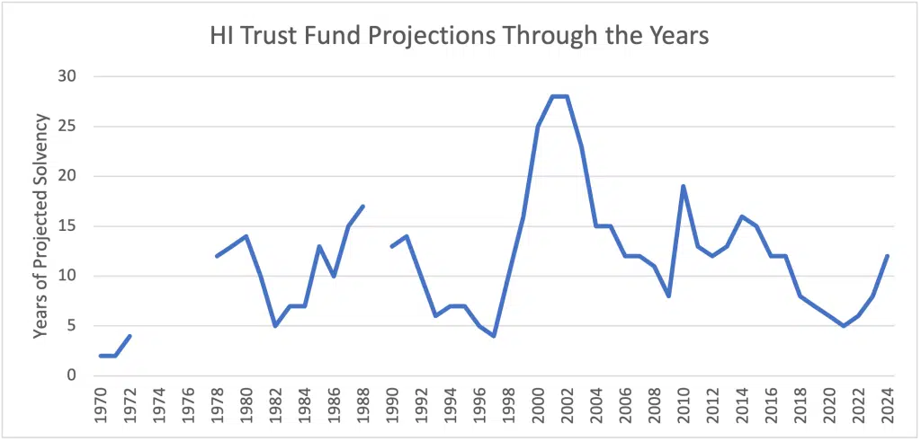 When the projected depletion dates cause enough consternation, they can trigger congressional intervention, like the statutory changes described above. Historically, each sharp dip in the depletion dates led to a corresponding congressional action—such as changes to provider payments—and a subsequent rise.[xxxiii]