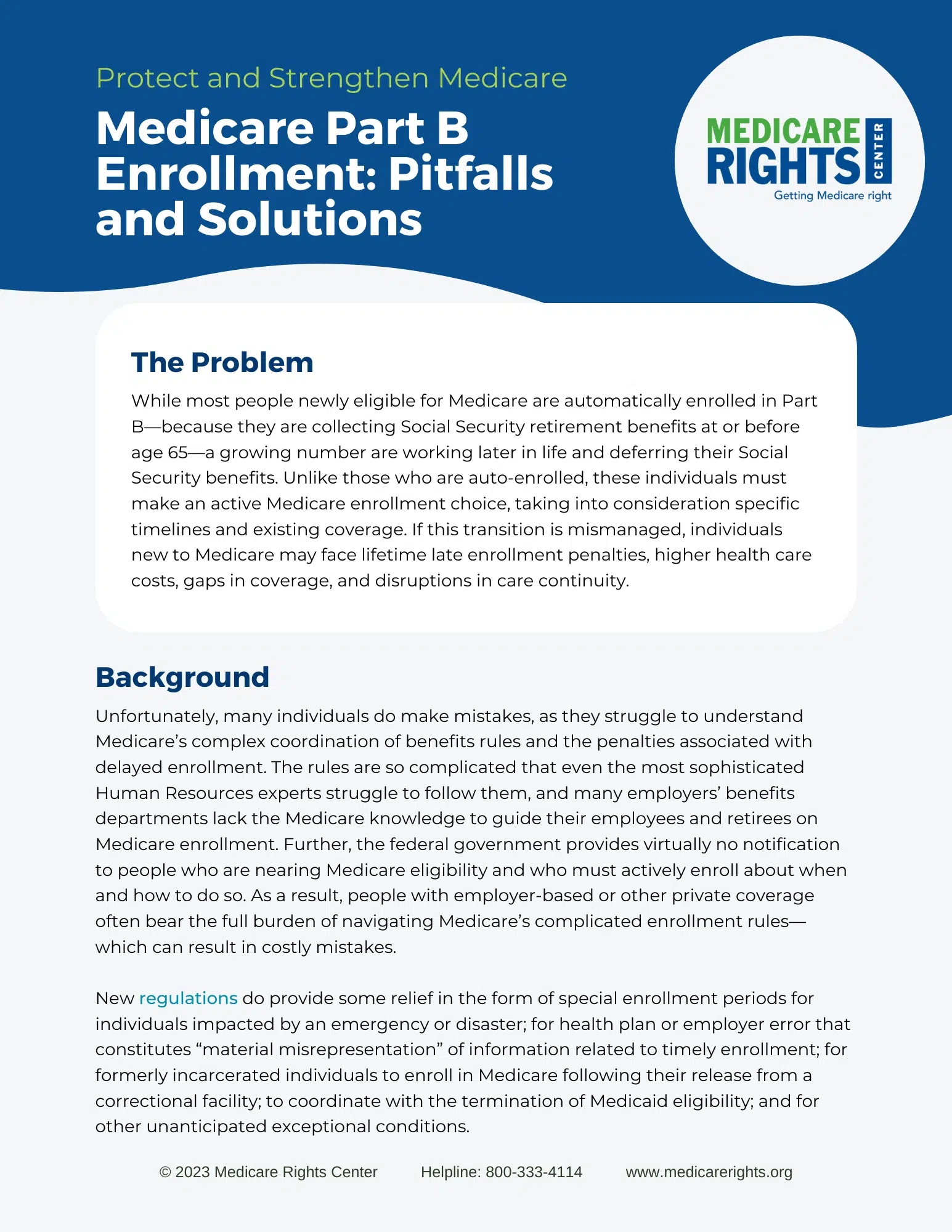 Most people new to Medicare are automatically enrolled because they are receiving Social Security when they become eligible. But a growing number are not and must enroll on their own, taking into consideration specific timelines, intricate rules, and existing coverage. Mistakes are common and carry serious consequences, such as lifelong financial penalties, high out-of-pocket costs, disruptions in care, and gaps in coverage. Yet, few remedies are available to help beneficiaries correct honest missteps. The Medicare Rights Center supports reducing the likelihood of mistakes—including by simplifying the enrollment process and better empowering beneficiary decision-making—and improving relief opportunities for those who need them.